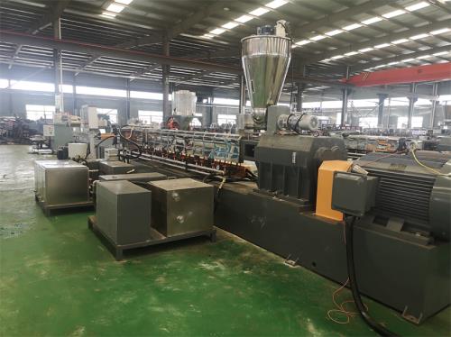 雙螺桿造粒機(jī)_雙螺桿塑料造粒機(jī)_佳德塑機(jī)JDL-65B雙螺桿水拉條機(jī)組一、系統(tǒng)機(jī)組技術(shù)參數(shù)Ⅰ、機(jī)器顏色:主機(jī)為公司標(biāo)色;電柜為電腦色Ⅱ、造粒工藝:單螺桿計(jì)量式喂料——-JDL-65B雙螺桿擠出機(jī)---—液壓板式換網(wǎng)——拉條機(jī)頭----6米不銹鋼水槽-----吹干機(jī)----龍門切粒機(jī)------2.5米不銹鋼振動(dòng)篩--------成品料倉------主機(jī)采用:PLC控制Ⅲ、作業(yè)物料:破碎料產(chǎn) 量:200-300公斤/小時(shí)(作業(yè)條件不同,產(chǎn)量稍有不同)設(shè)備特點(diǎn):整套設(shè)備是環(huán)保型,設(shè)備不需要接外循環(huán)水系統(tǒng);自帶循環(huán)冷卻統(tǒng)是我公司專利產(chǎn)品(發(fā)明專利號(hào):CN201911312134.6)1.最大好處:整套0水排放;無水污染;環(huán)保好過2.雙螺桿齒輪箱冷卻采用:采用環(huán)保冷卻系統(tǒng)(環(huán)保型:發(fā)明專利號(hào):CN201911312134.6)不需要接外循環(huán)水冷卻,不用徘外水;采用閉環(huán)循環(huán)系統(tǒng),不用擔(dān)心長時(shí)間使用水冷卻會(huì)產(chǎn)生水垢把冷卻器堵住,導(dǎo)致齒輪箱損壞3.雙螺桿主機(jī)水箱冷卻系統(tǒng)采用:采用環(huán)保冷卻系統(tǒng)(環(huán)保型:發(fā)明專利號(hào):CN201911312134.6)不需要接外循環(huán)水冷卻,不用徘外水;采用閉環(huán)循環(huán)系統(tǒng)4. 不銹鋼水槽:一臺(tái),L=6米,加寬加深,槽體為不銹鋼材質(zhì);水槽與吸干機(jī)過度體一件;不銹鋼材質(zhì),