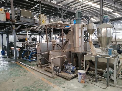 PU水下造粒代加工_PU水下造粒代加工_佳德JDL-75D雙螺桿水下造粒機(jī)組一、系統(tǒng)機(jī)組技術(shù)參數(shù)Ⅰ、機(jī)器顏色:主機(jī)為公司標(biāo)色;電柜為電腦色Ⅱ、造粒工藝:雙螺桿計(jì)量式喂料——-JDL-75D雙螺桿擠出機(jī)----——液壓板式換網(wǎng)——液壓柱式排料裝置---------水下熱切模頭------水泵-----離心脫水機(jī)------2.5米加長(zhǎng)振動(dòng)篩-----風(fēng)冷成品料倉(cāng)----采用:PLC控制Ⅲ、作業(yè)物料:TPU改性料 PU水下造粒代加工產(chǎn) 量:500-650公斤/小時(shí),注意事項(xiàng):作業(yè)條件不同,產(chǎn)量稍有不同特 點(diǎn):這套設(shè)備主機(jī)是環(huán)保型;主機(jī)設(shè)備不需要接外循環(huán)水系統(tǒng);自帶循環(huán)冷卻統(tǒng)是我公司專利產(chǎn)品,1.雙螺桿齒輪箱冷卻采用:采用環(huán)保冷卻系統(tǒng)(環(huán)保型:發(fā)明專利號(hào):CN201911312134.6)不需要接外循環(huán)水冷卻,不用徘外水;采用閉環(huán)循環(huán)系統(tǒng),不用擔(dān)心長(zhǎng)時(shí)間使用水冷卻會(huì)產(chǎn)生水垢把冷卻器堵住,導(dǎo)致齒輪箱損壞2.雙螺桿主機(jī)水箱冷卻系統(tǒng)采用: